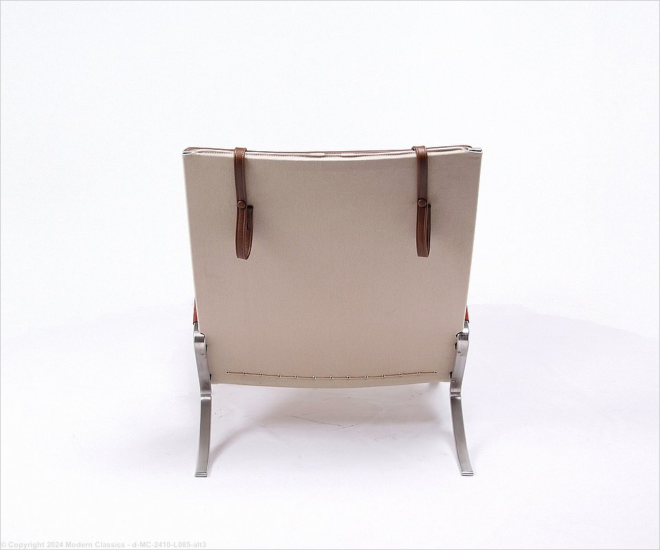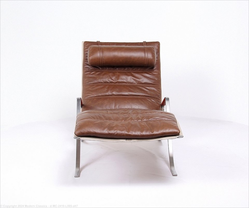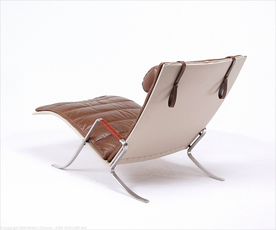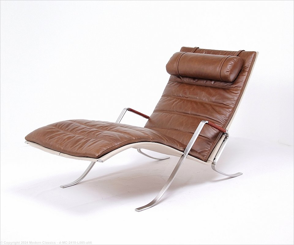 MC-2410 The FK 87 Grasshopper chair was designed by Preben Fabricius & Jorgen Kastholm in 1968 and we are proud to make our own version of this chaise lounger. The frame is brushed stainless steel with leather-wrapped armpads. Pillow is adjustable.