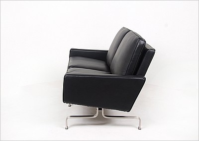 The construction of the PK31 consists of separate panels for the seat, back and sides. Underneath, are brushed satin stainless steel leg frames that are connected with a separate steel bar that is one length for the single chair, double that for the loveseat and three times that length for the sofa.